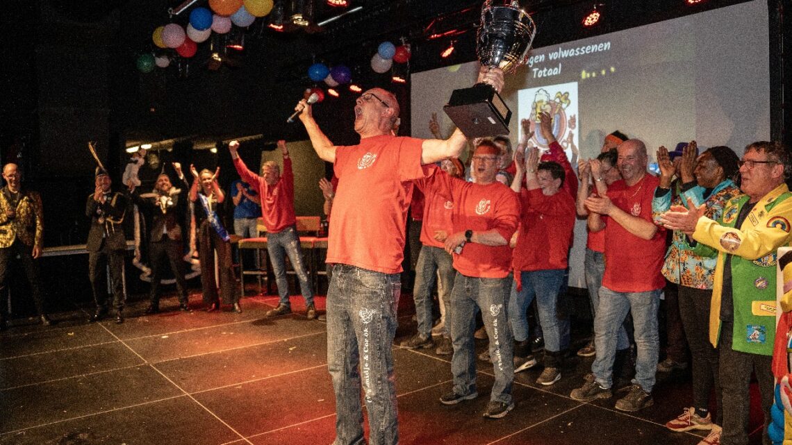 Na de barre tocht, het terugbrengen van de wagen en het verzamelen in de Berchplaets is daar dan het “Moment Supreme”. Om 11 over 11 start de prijsuitreiking, waarvan je weet dat die tot ver in de kleine uurtjes zal gaan duren. Maar als je dan deze coverfoto kunt maken, met de ultieme ontlading van ’t Smidje & Cor ok, dan weet je waar je het voor doet. De vreugde in de andere categorieën was er overigens niet minder om. De “Lôchte Vrôllie”, die in hun twaalfde optocht de eerste plek veroverde bij de Loopgroep Volwassenen, wisten er nog een dansje op het podium uit te persen. En zo waren er heel veel deelnemers die op hun manier hun feestje vierden. Meedoen is belangrijker dan winnen, maar ja, als je toch meedoet, dan wil je natuurlijk wel winnen…